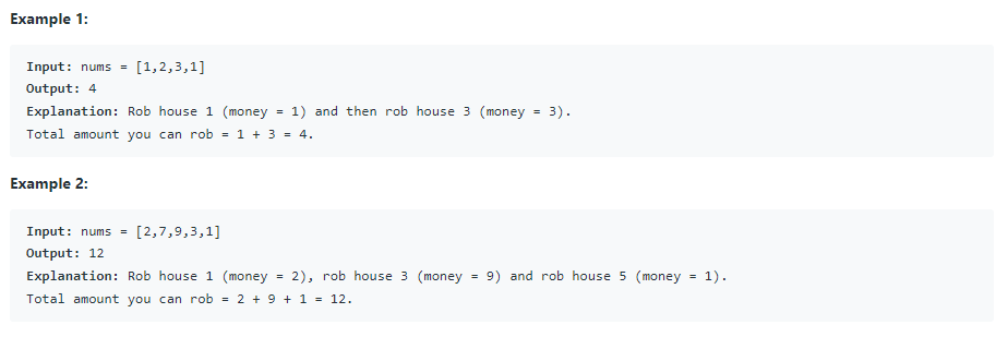 (한 줄로 나열된) 집집마다 일정 금액의 돈이 숨겨져 있는데, 보안시스템이 있어 같은 날 밤 인접한 두 집에 강도가 들면 자동으로 경찰에 연락하게 된다. 주어진 각 집의 돈의 액수를 나타내는 정수 배열 nums에 대해 경찰에 알리지 않고 훔칠 수 있는 최대 금액을 리턴하여라.