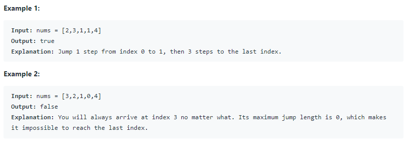 주어진 정수 배열 nums의 각 원소는 해당 위치에서 jump 할 수 있는 최대 길이를 나타낸다. 최초로 배열의 첫 index에 배치된다고 할 때 jump를 통해 마지막 index에 도달할 수 있으면 true를, 그렇지 않으면 false를 리턴하여라.