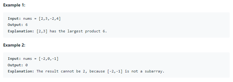 주어진 nums 배열에 대해 가장 큰 곱을 나타내는 연속된 subarray를 찾아 그 곱을 리턴하여라.