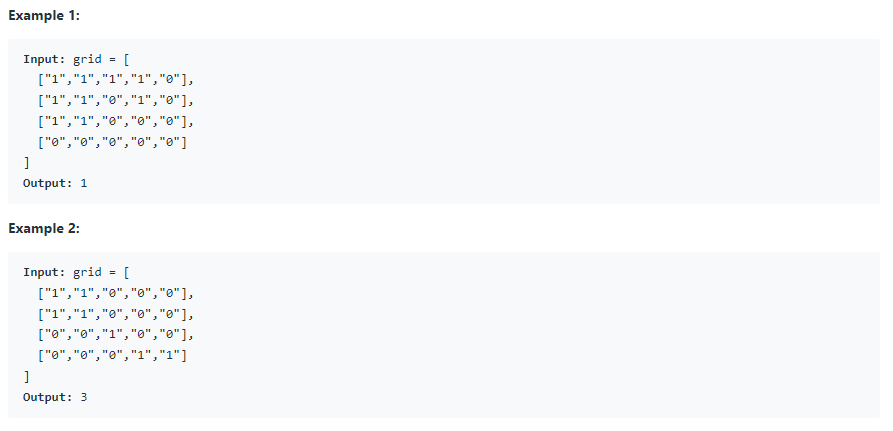 1(육지)과 0(바다)로 이루어진 지도를 나타내는 주어진 m x n 크기의 2차원 격자 grid에 대해 섬의 수를 리턴하여라.