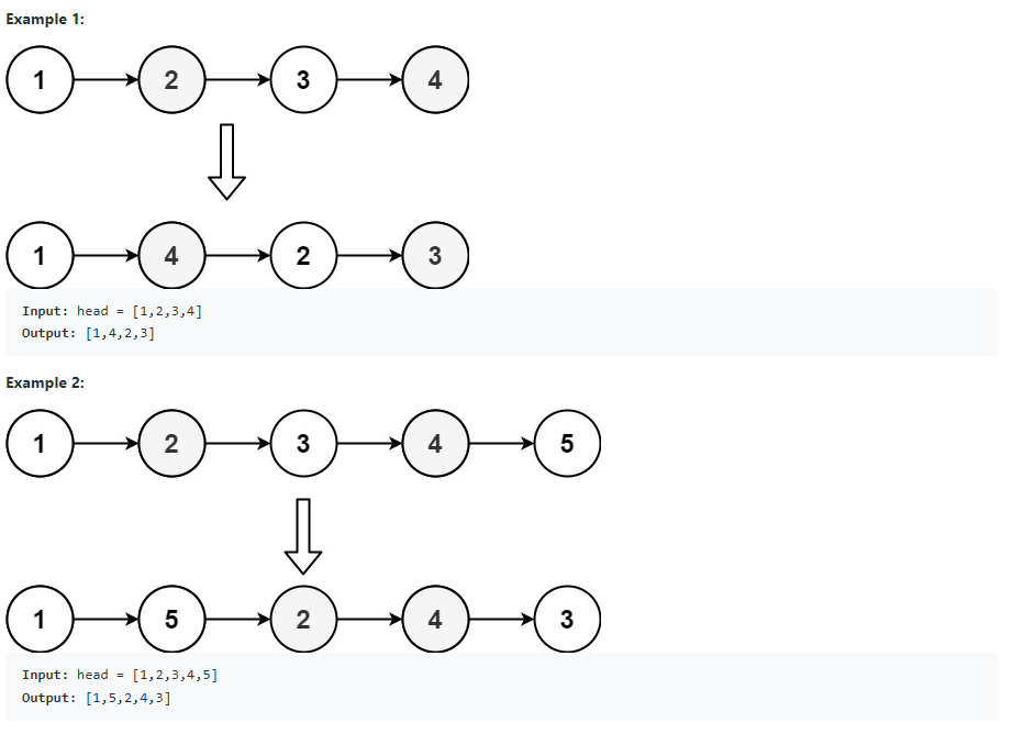 singly linked-list가 주어질 때(L0 → L1 → … → Ln - 1 → Ln) 순서를 재정렬해 L0 → Ln → L1 → Ln - 1 → L2 → Ln - 2 → … 와 같은 형태가 되도록 하여라. list 노드의 값은 변화시킬 수 없고, 오직 노드 자체만 변경할 수 있다.